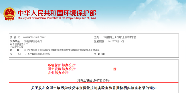 近日,環境保護部、國土資源部和農業部聯合發文公布《關于發布全國土壤污染狀況詳查質量控制實驗室和首批檢測實驗室名錄的通知》(環辦土壤函〔2017〕1138號),廣電計量河南子公司、湖南子公司,經歷重重考核評審,最終從全國幾百家實驗室中脫穎而出,雙雙成功入選全國土壤污染狀況詳查實驗室名錄。