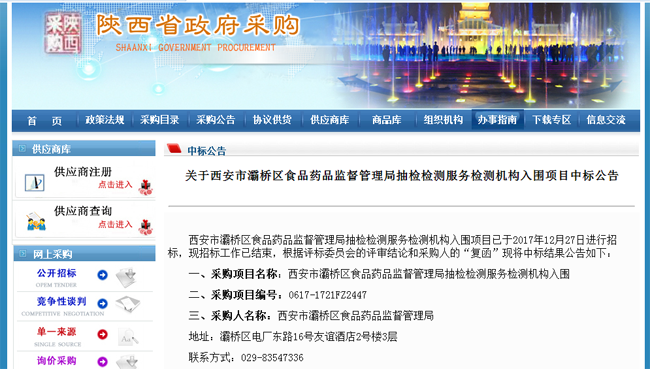 關(guān)于西安市灞橋區(qū)食品藥品監(jiān)督管理局抽檢檢測(cè)服務(wù)檢測(cè)機(jī)構(gòu)入圍項(xiàng)目中標(biāo)公告