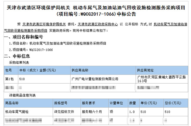 天津市武清區(qū)環(huán)境保護(hù)局機(jī)關(guān) 機(jī)動(dòng)車尾氣及加油站油氣回收設(shè)施檢測(cè)服務(wù)采購(gòu)項(xiàng)目 (項(xiàng)目編號(hào):WQCG2017-1066)中標(biāo)公告