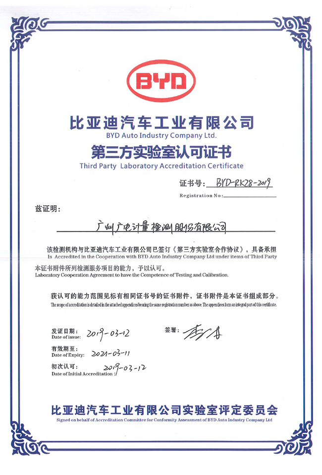 廣電計量獲比亞迪CNAS全項目第三方實驗室認可