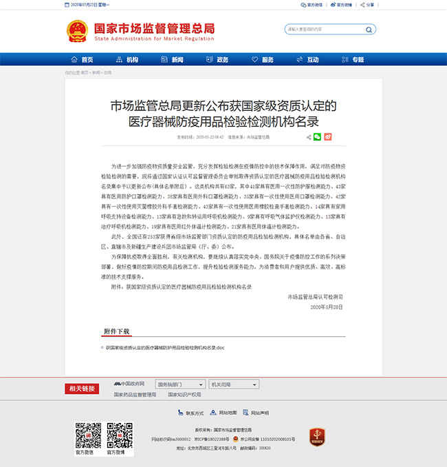 5月22日,國家市場監督管理總局更新公布63家獲國家級資質認定的醫療器械防疫用品檢驗檢測機構名錄。廣電計量控股子公司——方圓廣電檢驗檢測股份有限公司(簡稱方廣檢測)廣州、無錫分公司進入名錄,具有醫用紅外體溫計、醫用體溫計檢測能力。