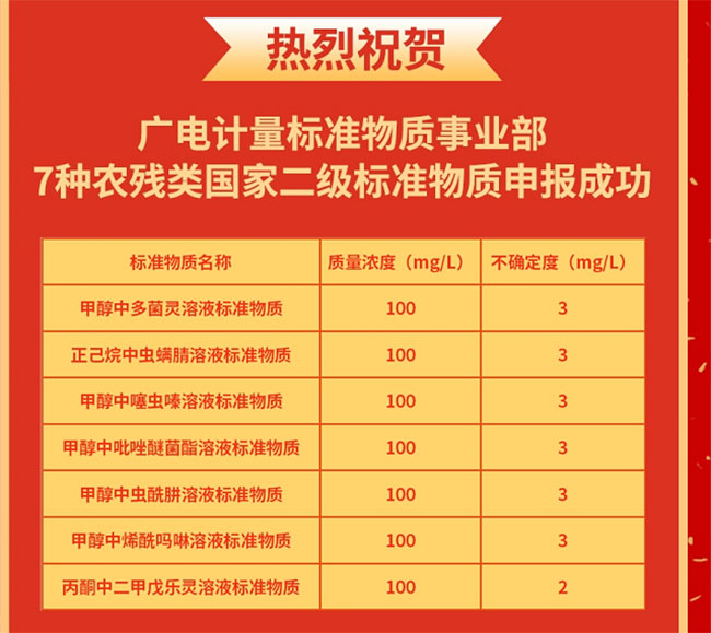 9月7日,廣州廣電計量檢測股份有限公司(簡稱:廣電計量)與中國農業科學院農業質量標準與檢測技術研究所(簡稱:中國農科院質標所)聯合研制的甲醇中多菌靈溶液標準物質等7種農藥類標準物質,順利通過了全國標準物質管理委員會的專家評審,成為廣電計量首批研發的國家有證標準物質。