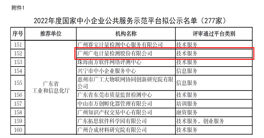 10月25日,根據《國家中小企業公共服務示范平臺認定管理辦法》(工信部企業〔2017〕156號)、《工業和信息化部辦公廳關于組織推薦2022年度國家中小企業公共服務示范平臺的通知》(工信廳企業函﹝2022﹞129號),工業和信息化部組織開展了2022年度國家中小企業公共服務示范平臺評審工作。廣電計量憑借領先的綜合技術服務能力、穩健的業績增長以及較強的公信力,成功獲評國家中小企業公共服務示范平臺,此資質將從即日起延續三年。