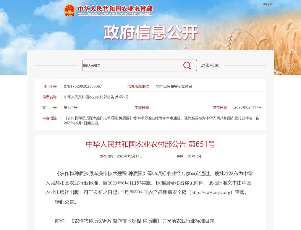 近日,農業農村部發布了中華人民共和國農業農村部公告第651號,《農作物種質資源庫操作技術規程 種質圃》等96項標準將于 2023年6月1日起實施。其中包括廣電計量檢測集團股份有限公司旗下子公司——河南廣電計量檢測有限公司、廣電計量(湖南)檢測有限公司參與起草的NY/T 1121.9—2023《土壤檢測 第9部分:土壤有效鉬的測定》和NY/T 1121.14—2023《土壤檢測 第14部分:土壤有效硫的測定》兩項行業標準。