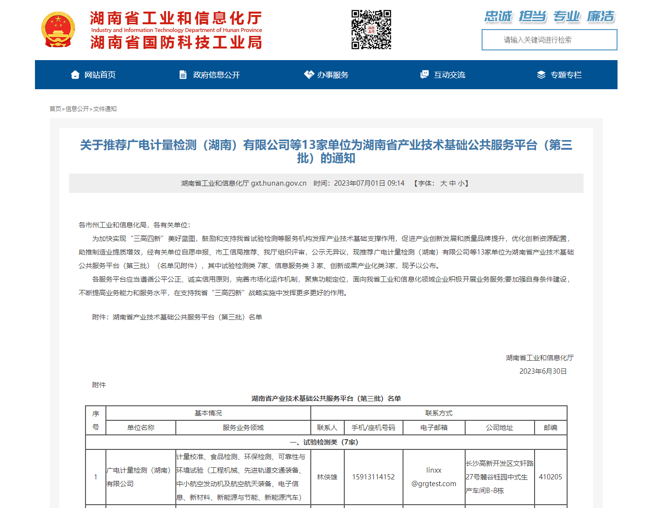 近日,湖南省工信廳發布湖南省產業技術基礎公共服務平臺(第三批)推薦名單。廣電計量檢測(湖南)有限公司(簡稱湖南廣電計量)經長沙市工業和信息化局推薦、湖南省工業和信息化廳評審,成功入選試驗檢測類公共服務平臺,為技術創新和產業發展提供強有力的支撐和服務。