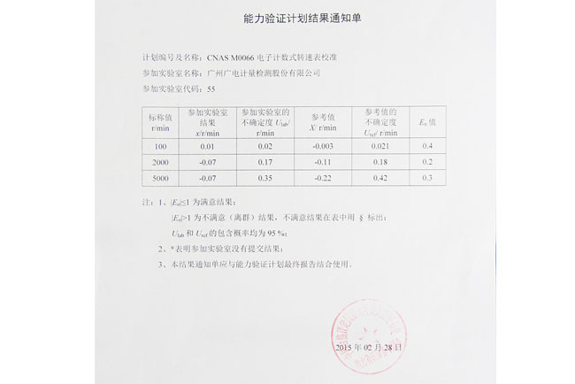 GRGT近期收到中國合格評定國家認可中心(CNAS)關于“CNAS M0066電子計數式轉速表校準”能力驗證計劃結果通知單,結果顯示GRGT計量中心以優異成績通過本次能力驗證。