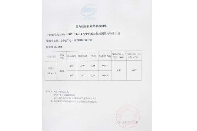 GRGT鄭州檢測基地近期收到環(huán)境保護(hù)部標(biāo)準(zhǔn)樣品研究所關(guān)于“IERM T14-14 水中硝酸鹽氮檢測”能力驗證計劃結(jié)果通知單,結(jié)果顯示GRGT鄭州檢測基地化學(xué)分析實驗室檢測結(jié)果全部靠近中位值,成績突出,順利通過本次能力驗證。