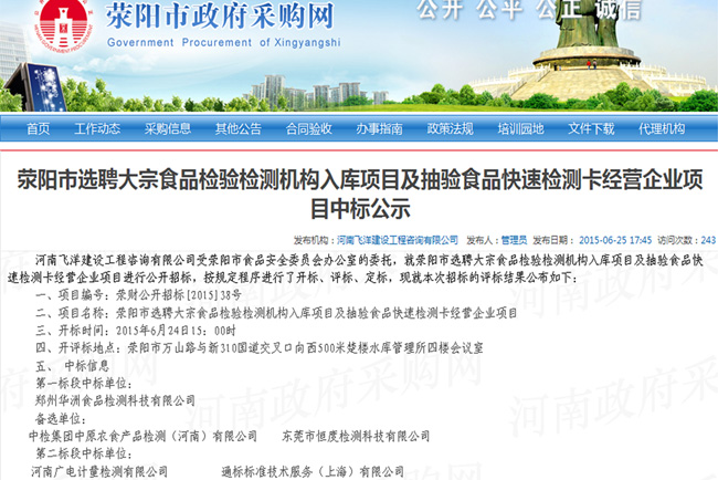 6月24日,廣電計量河南子公司成功中標 “滎陽市選聘大宗食品檢驗檢測機構入庫項目及抽驗食品快速檢測卡經營企業項目”第二標段,項目執行時間為2015年6月至2016年底,內容包括食品、農產品抽樣及檢測一條龍服務,中標金額500萬元。