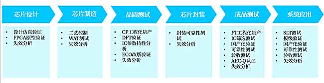 集成電路測(cè)試主要分為研發(fā)設(shè)計(jì)階段的仿真驗(yàn)證,芯片制造環(huán)節(jié)的晶圓工藝控制及可接受測(cè)試(WAT),晶圓級(jí)測(cè)試(CP),封裝成品測(cè)試(FT)以及應(yīng)用端的系統(tǒng)級(jí)測(cè)試(SLT)。