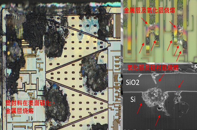 常見ESD物理失效表現:襯底擊穿、多晶硅熔融、GOX pin hole、contact melted、metal melted等(見圖1),常見EOS物理失效表現:氧化層、金屬層大面積熔融以及封裝體碳化等現象(見圖2)。