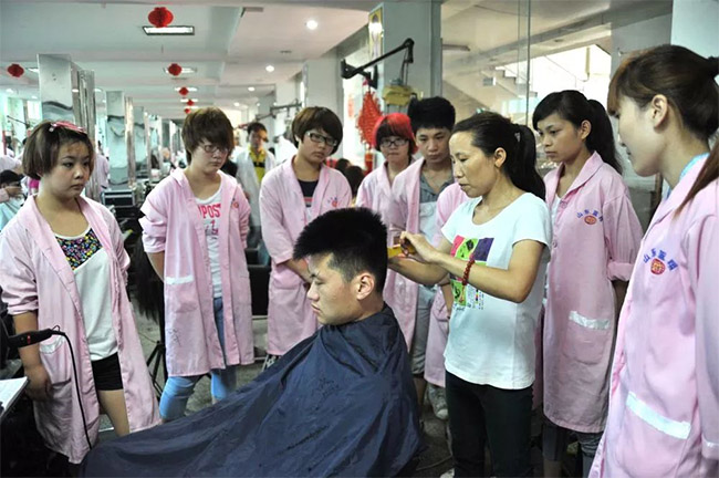 2014年6月23日,山東藍(lán)翔高級(jí)技工學(xué)校美容美發(fā)專(zhuān)業(yè)的學(xué)生在觀看老師的教學(xué)示范。