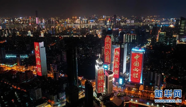 這是3月15日晚拍攝的武漢市江漢區西北湖附近高層建筑外墻打出“武漢必勝”“中國必勝”字樣(無人機照片)。夜幕降臨,湖北武漢不少建筑點亮了景觀燈,為武漢加油。新華社記者 陳曄華 攝