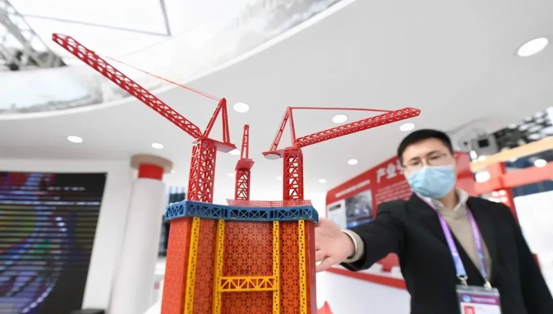 △第三屆進(jìn)博會上展出的“空中造樓機(jī)”不僅較傳統(tǒng)施工裝備更加安全智能,還可縮短20%的工期。