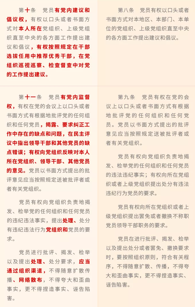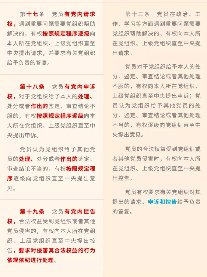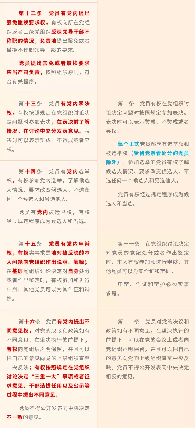新修訂《條例》修改了2004年《條例》分別用一個條文對應(yīng)黨章第四條規(guī)定的一個方面權(quán)利的體例安排,將黨章規(guī)定的8個方面黨員權(quán)利進一步細化,規(guī)定黨員享有黨內(nèi)知情權(quán)、接受黨的教育培訓權(quán)、黨內(nèi)參加討論權(quán)、黨內(nèi)建議和倡議權(quán)、黨內(nèi)監(jiān)督權(quán)、黨內(nèi)提出罷免撤換要求權(quán)、黨內(nèi)表決權(quán)、黨內(nèi)選舉權(quán)和被選舉權(quán)、黨內(nèi)申辯權(quán)、黨內(nèi)提出不同意見權(quán)、黨內(nèi)請求權(quán)、黨內(nèi)申訴權(quán)、黨內(nèi)控告權(quán)等13項權(quán)利。