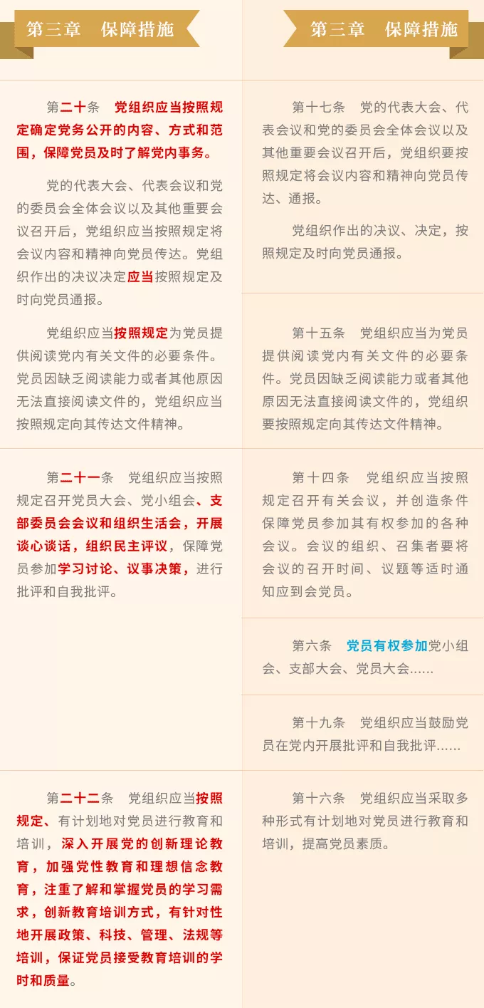 新修訂《條例》貫徹“堅持充分全面保障黨員權(quán)利”的原則,設(shè)立“保障措施”專章,系統(tǒng)規(guī)定了20項保障措施,在保障黨員權(quán)利方面更加充分全面、有力有效。