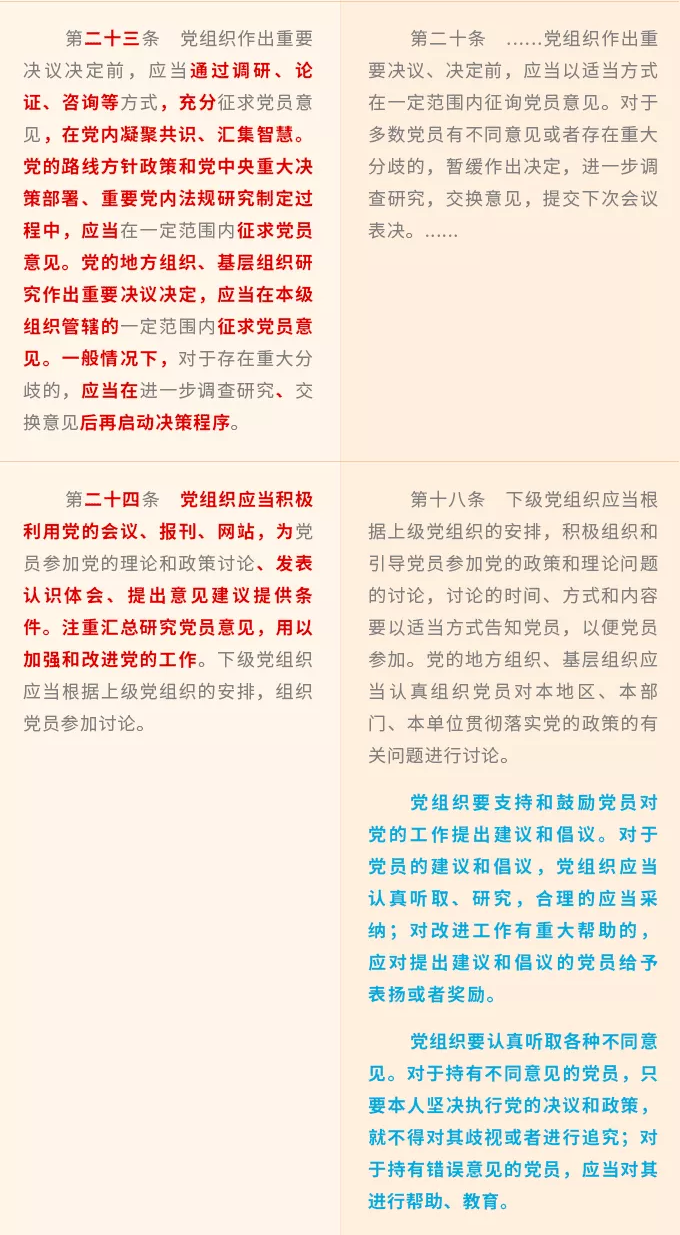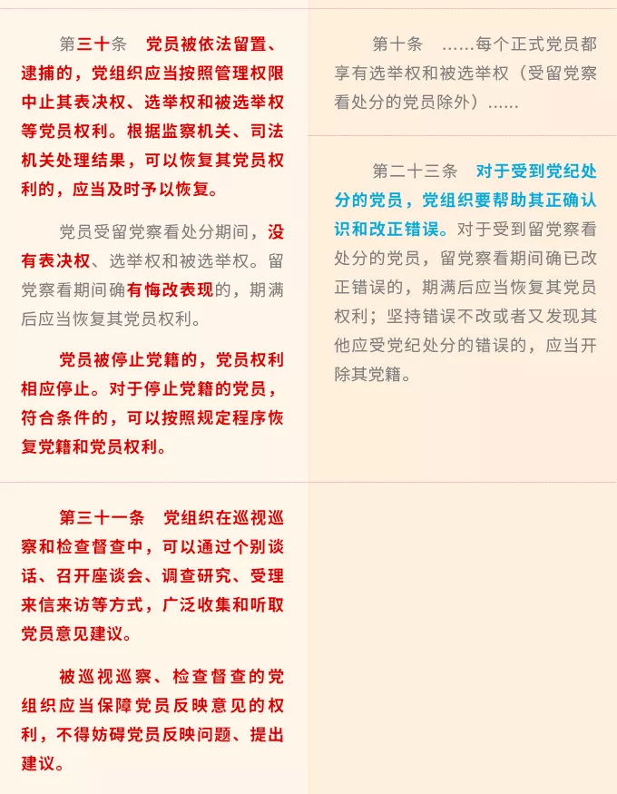 努力實現(xiàn)多層次多渠道全方位保障權(quán)利。比如,第三十一條規(guī)定的巡視巡察檢查督查中聽取黨員意見,對應(yīng)保障黨員建議和倡議權(quán)、監(jiān)督權(quán)、提出不同意見權(quán)等多項權(quán)利;對黨員監(jiān)督權(quán)的保障,涉及第二十七條規(guī)定的支持黨員提出建議和倡議、第三十二條規(guī)定的嚴格落實黨內(nèi)民主監(jiān)督制度等多項措施。