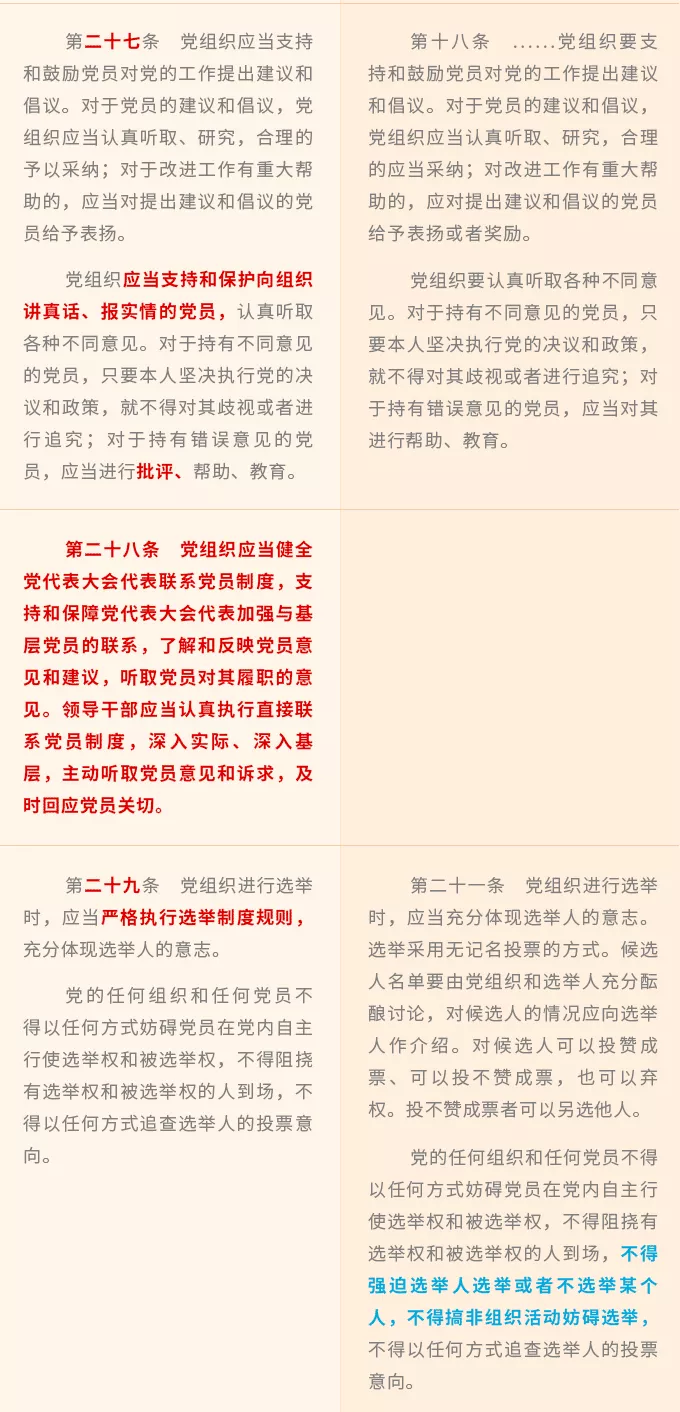 總結(jié)有關(guān)經(jīng)驗做法和創(chuàng)新性制度,新增了系列保障措施。比如,第二十五條規(guī)定的創(chuàng)新方法手段,第二十八條規(guī)定的健全黨代表、領(lǐng)導干部聯(lián)系黨員制度,第三十三條規(guī)定的落實“三個區(qū)分開來”要求等。
