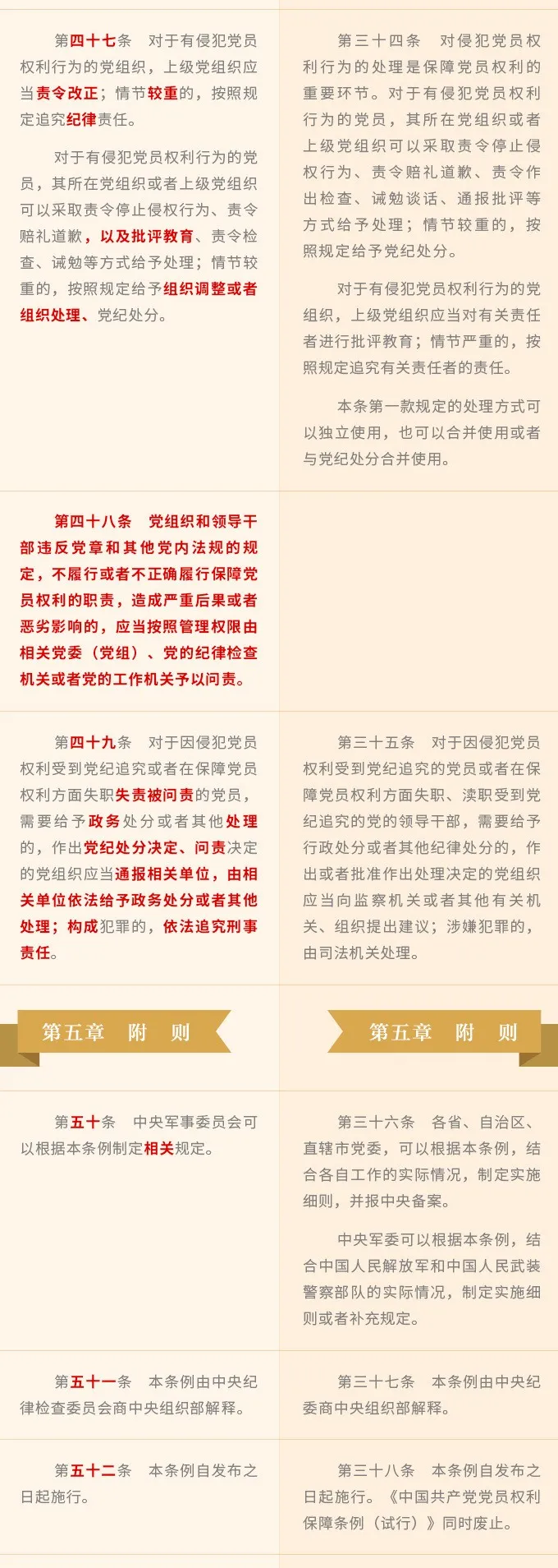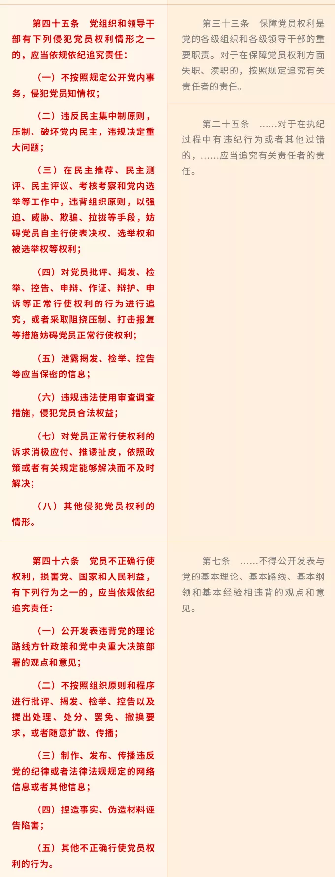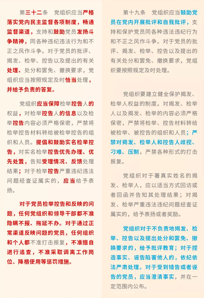 新修訂《條例》將嚴明紀律規(guī)矩的精神貫穿全篇,在第三章“保障措施”中針對黨組織和領(lǐng)導干部強調(diào)了相關(guān)紀律要求,特別是在第四章“職責任務(wù)和責任追究”中詳細列明了黨組織和領(lǐng)導干部侵犯黨員權(quán)利的8類具體情形,如不按照規(guī)定公開黨內(nèi)事務(wù),侵犯黨員知情權(quán);泄露揭發(fā)、檢舉、控告等應(yīng)當保密的信息等等。