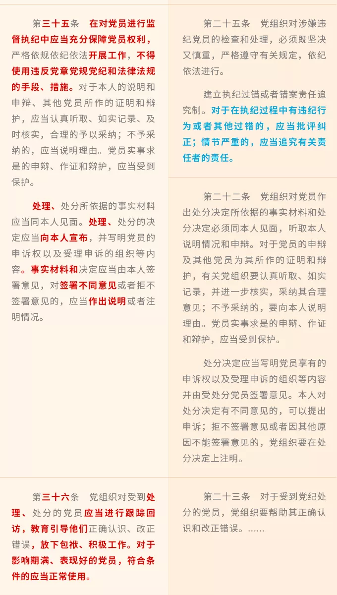 進一步明確了黨的紀律檢查機關(guān)在保障黨員權(quán)利方面的職責,將保障黨員權(quán)利貫穿監(jiān)督執(zhí)紀工作全過程,規(guī)定紀律檢查機關(guān)要加強監(jiān)督檢查,受理和處置黨員權(quán)利保障方面的檢舉、控告和申訴,對侵犯黨員權(quán)利的案件進行檢查和處理。