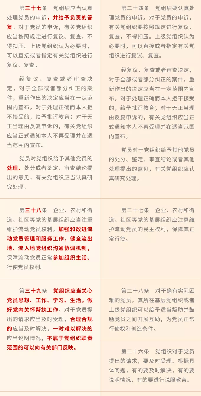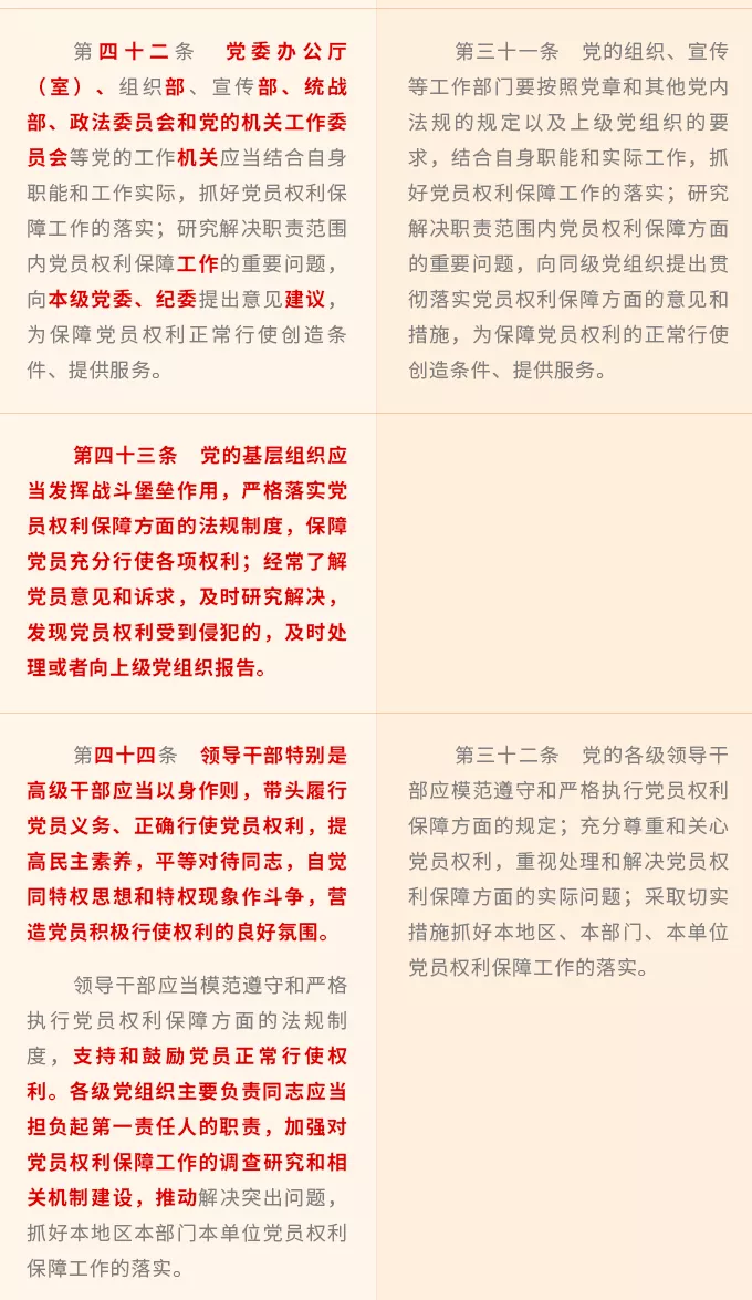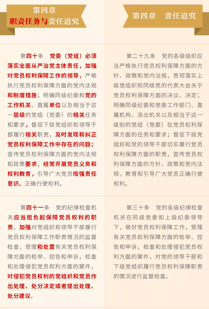 壓實各級黨組織和領(lǐng)導干部權(quán)利保障職責,增強全黨共同負責、抓好落實的合力,新修訂《條例》對黨委(黨組)、黨的紀律檢查機關(guān)、黨的工作機關(guān)、黨的基層組織、黨的領(lǐng)導干部在保障黨員權(quán)利方面的職責任務(wù),逐一作出明確規(guī)定。